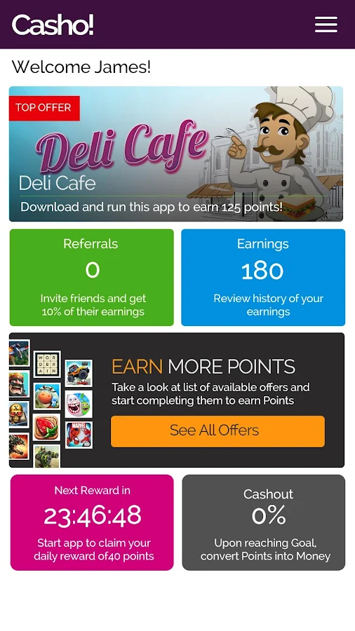 Casho partners with brands in retail, shopping, insurance, entertainment, finance, casino, games, auto, banking, food, and other industries to provide highest possible payouts. Fill out your profile and answer all interview questions and opinion surveys to match the high paying tasks and receive the biggest rewards and gifts. If you want to market or promote your app contact us on casho.com or casho support system and receive super targeted installs. Market Research and reward programs or sponsorships too.